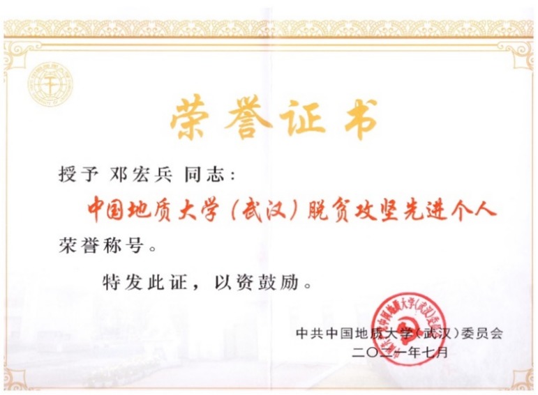 图3邓宏兵教授被授予“擦边直播 (武汉)脱贫攻坚先进个人”荣誉证书