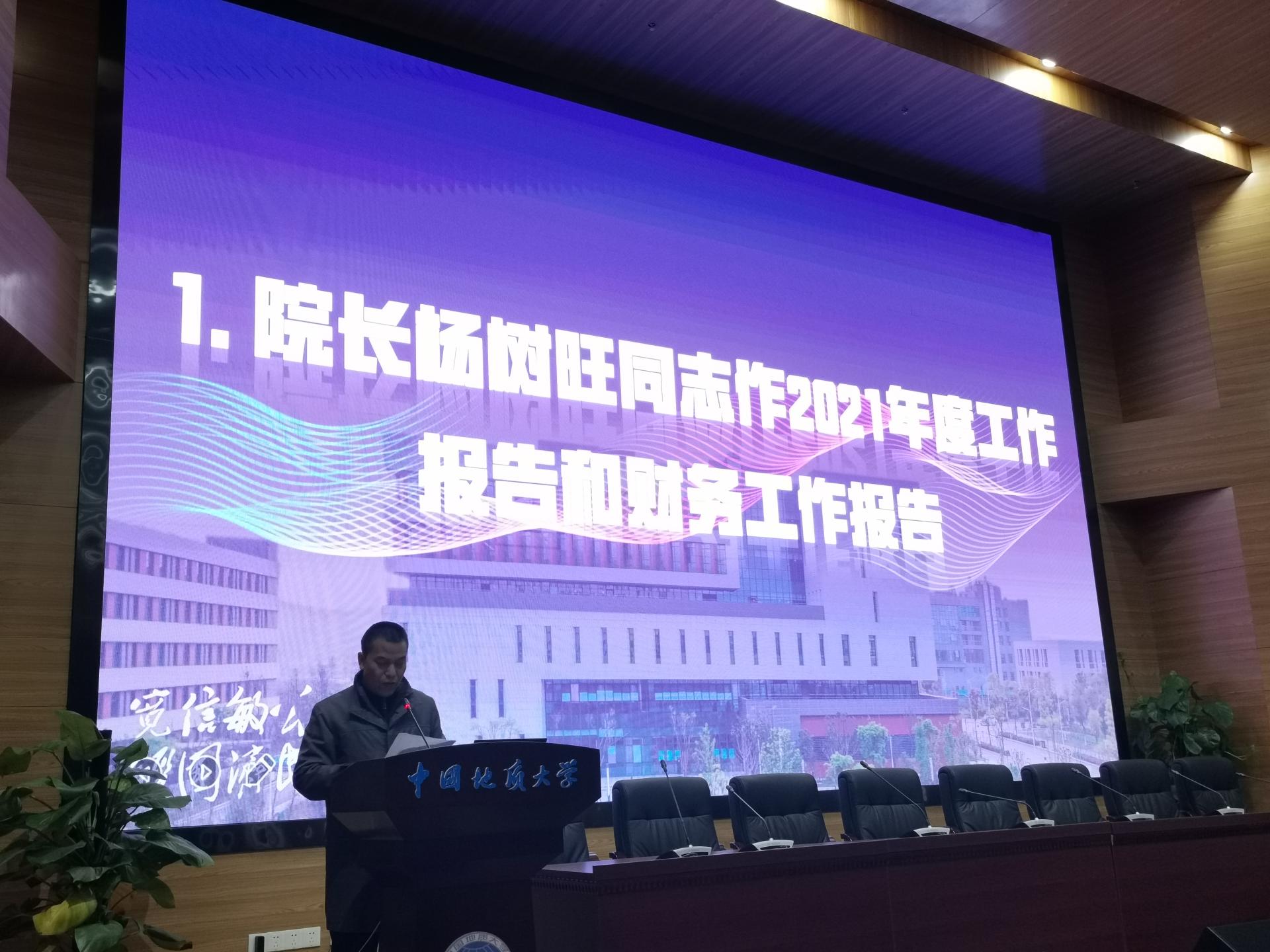 院长杨树旺同志代表学院党政班子从党的建设、学科与专业建设、人才培养与学生工作、科学研究与社会服务、文化建设与工会工作等方面回顾了学院在2021年各项工作的开展情况,实事求是地总结了学院在“十四五”开局之年取得的各项成绩,分析了学院发展中存在的问题和不足,从加强党的建设、加强人才引育、加强学科建设、加强课程思政、加强能力培养、深化国际合作、完善经管大楼建设、强化学院文化建设等方面提出了新的一年学院发展建设的方向、任务、措施和路径。报告是进一步落实我院“十四五”规划的行动纲领,必将对我院发展起到承前启后的影响。随后,院长杨树旺同志还向大会作《2021年度财务工作报告》。